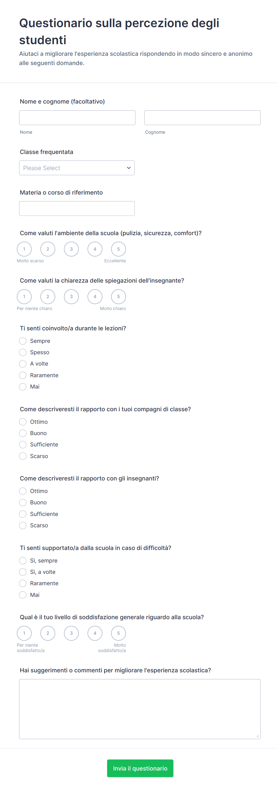 - Per i questionari per i genitori: Aggiungi valutazioni sulla soddisfazione, feedback sulla comunicazione e suggerimenti per miglioramenti.
