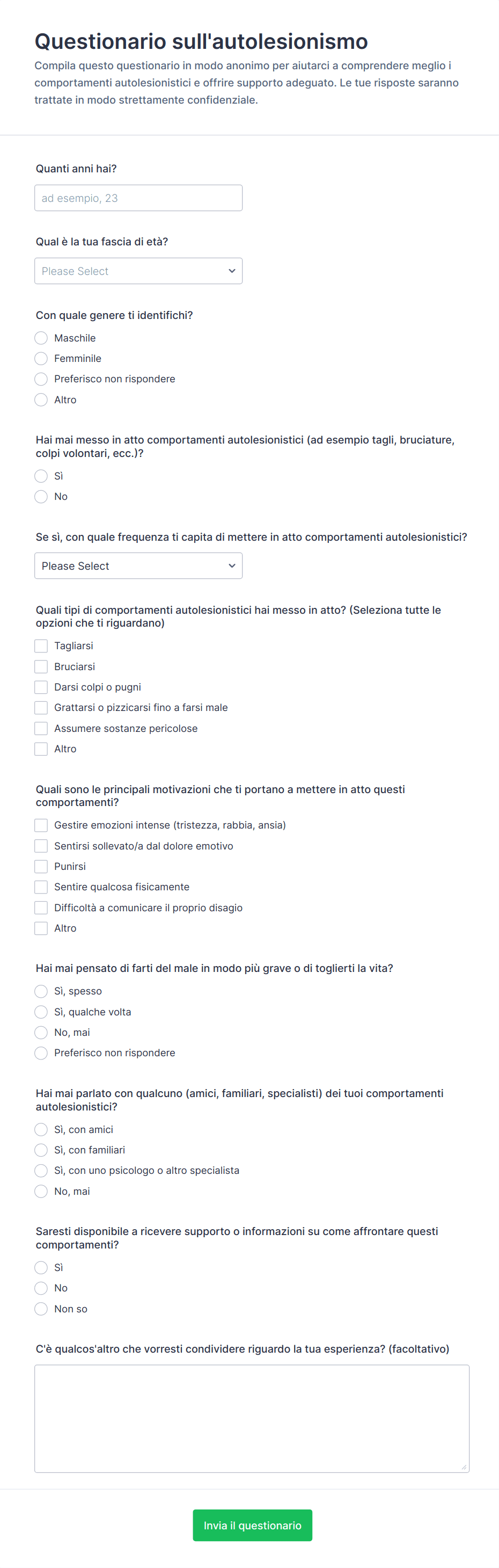 - La scelta dei tipi di domande (scelte multiple, scale di valutazione, testo aperto) varia a seconda del caso d'uso.