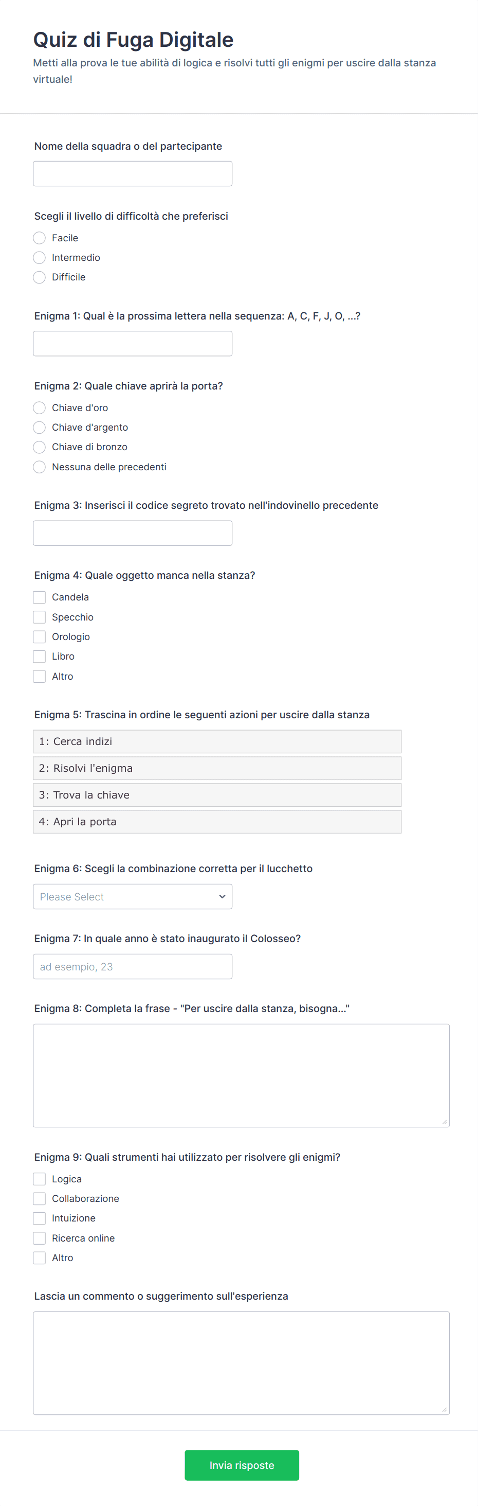 I modelli di quiz sono moduli predefiniti per facilitare il processo di costruzione di quiz per una varietà di scopi, come l'educazione, la formazione dei dipendenti, la generazione di lead, il coinvolgimento agli eventi e altro ancora. Questi modelli forniscono un modo strutturato per presentare domande, raccogliere risposte e valutare o assegnare automaticamente un punteggio alle risposte. Che tu sia un insegnante che valuta la conoscenza degli studenti, un'azienda che esegue test sulla conoscenza di un prodotto, o un marketer che crea un divertente quiz di personalità, i modelli di quiz offrono una base flessibile da cui partire, per soddisfare le tue specifich esigenze. Possono essere utilizzati per esami online, giochi a quiz, valutazioni di onboarding, quiz di feedback dei clienti e moduli di apprendimento interattivi.