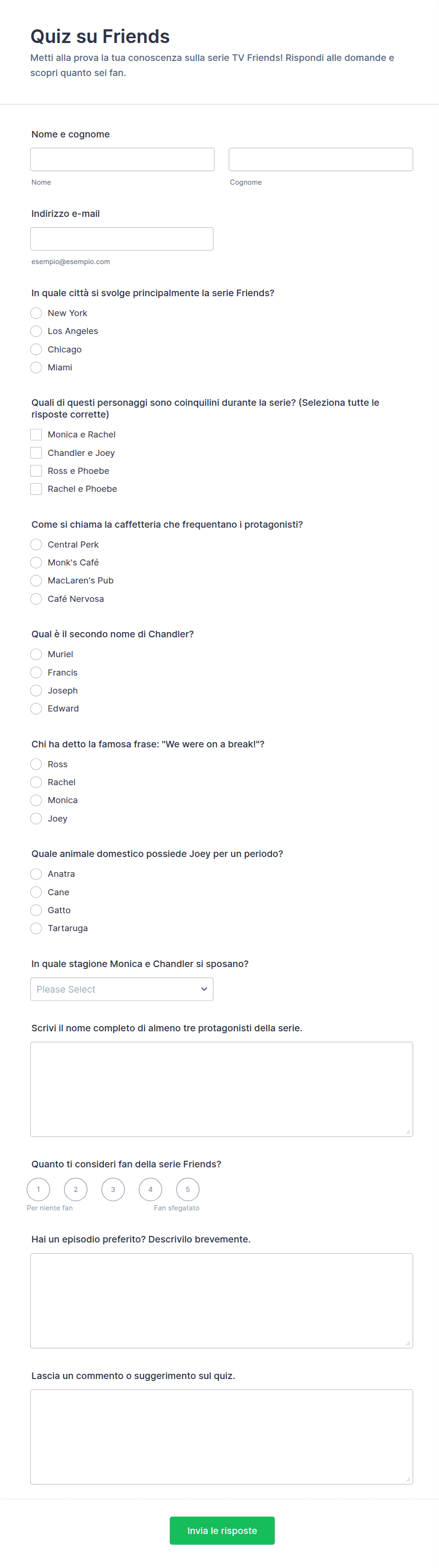 I modelli di quiz possono raccogliere risposte a domande a scelta multipla, vero/falso, aperte e basate su immagini, così come dettagli dei partecipanti come nome, email e punteggi.