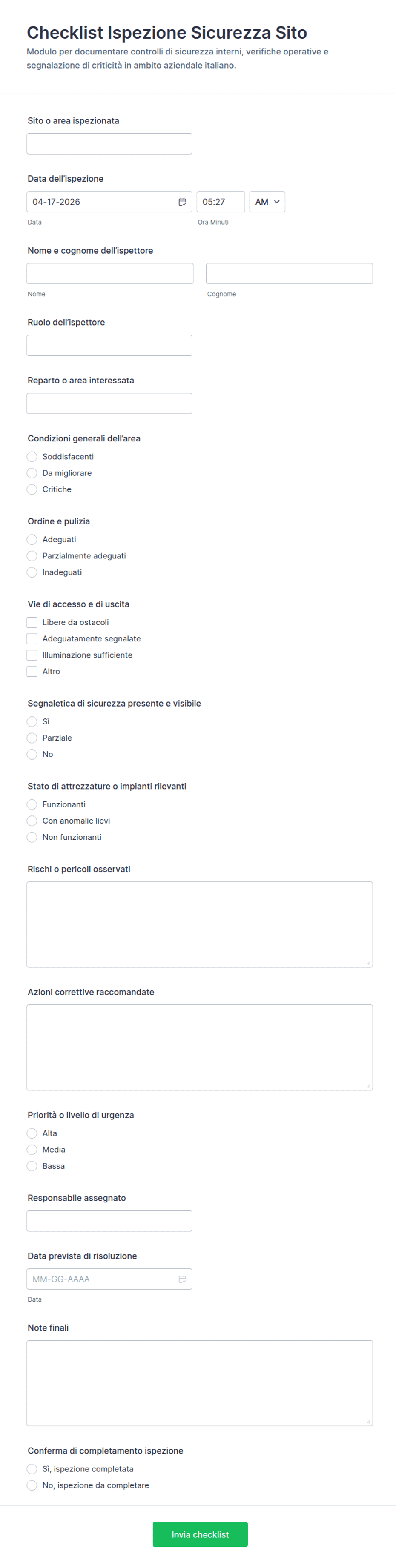 Un modulo di ispezione sulla sicurezza è un documento strutturato utilizzato per valutare e registrare le condizioni di sicurezza di un luogo di lavoro, attrezzature o impianti. Aiuta a identificare i rischi, garantire la conformità alle normative e documentare le azioni correttive.