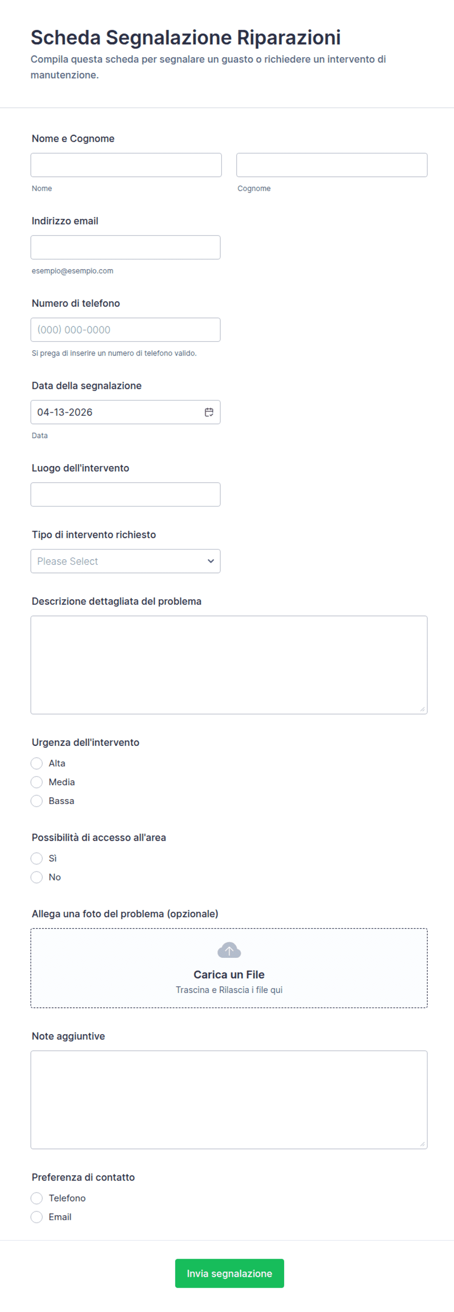 Gestisci richieste di manutenzione e interventi tecnici con la Scheda Segnalazione Riparazioni Form di Jotform, utile per condomìni, uffici e strutture che vogliono velocizzare la raccolta dati e la gestione delle risposta.