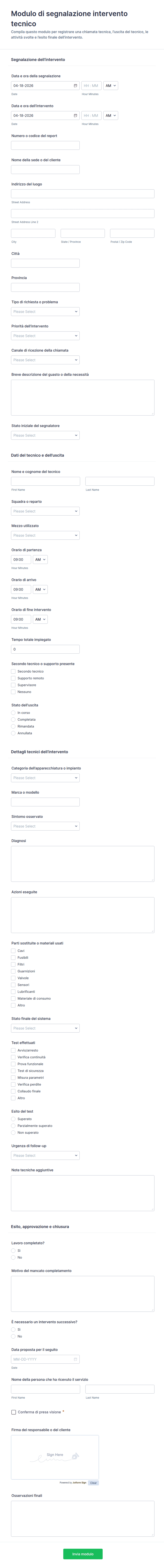 Campi tipici includono i dettagli del richiedente, la descrizione del problema o dell'attività, la posizione, l'urgenza, i documenti giustificativi e la data di completamento preferita.