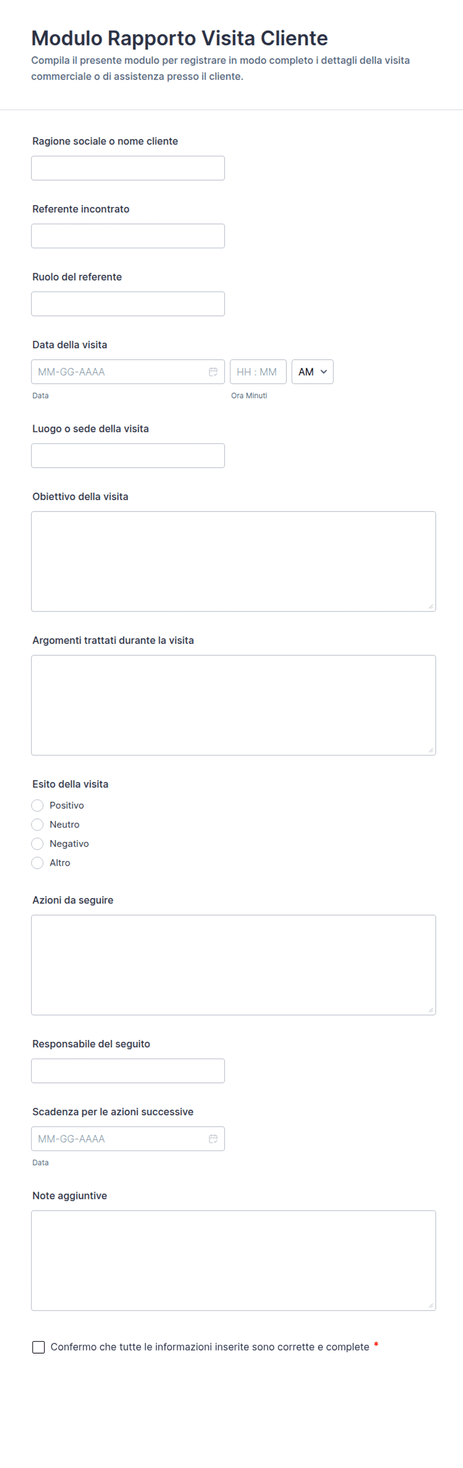 - Rapporti sugli incidenti: Richiedono campi di testo dettagliati, caselle di controllo per i tipi di incidenti e campi di caricamento di file per le prove.