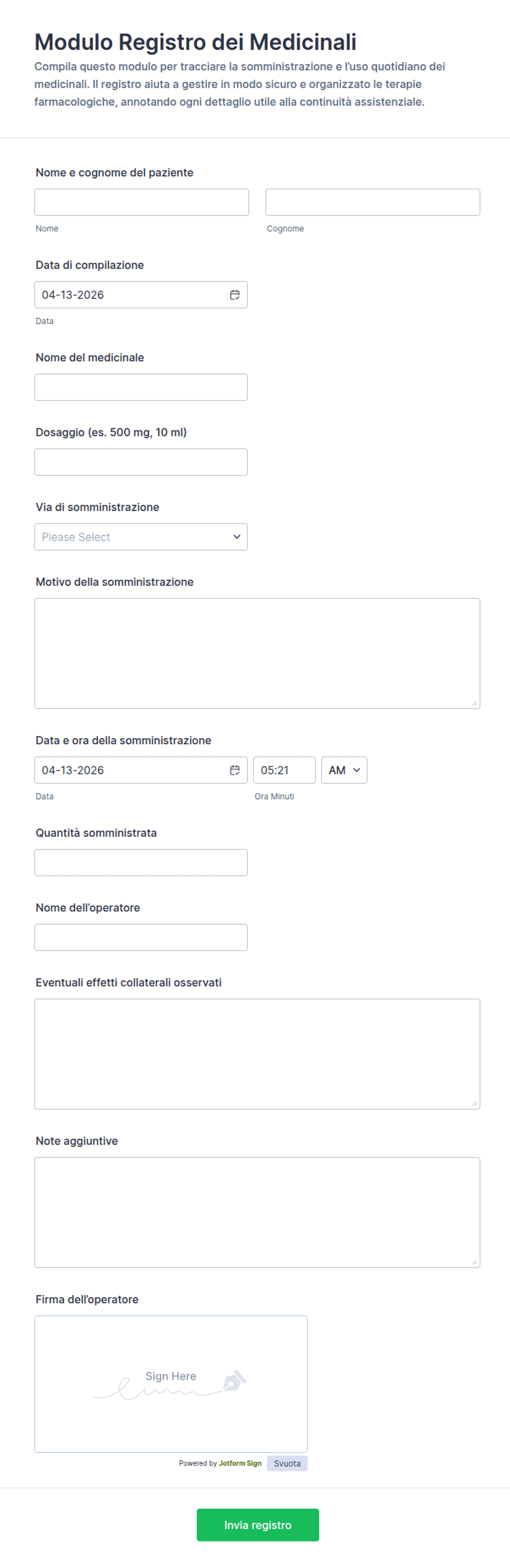 Che la tua farmacia stia somministrando vaccini contro il COVID-19, vaccini antinfluenzali o semplicemente raccogliendo informazioni sui pazienti, fallo in modo sicuro e veloce con Jotform! Puoi utilizzare questo modulo per raccogliere prenotazioni di vaccini, moduli di consenso, sondaggi e altro da qualsiasi dispositivo. Con i moduli per farmacie online, puoi personalizzare rapidamente uno dei nostri template per adattarlo alle esigenze della tua farmacia, quindi incorporare il modulo nel tuo sito web, condividerlo con i pazienti tramite link o lasciare che lo compilino di persona sul tablet o computer della tua farmacia.