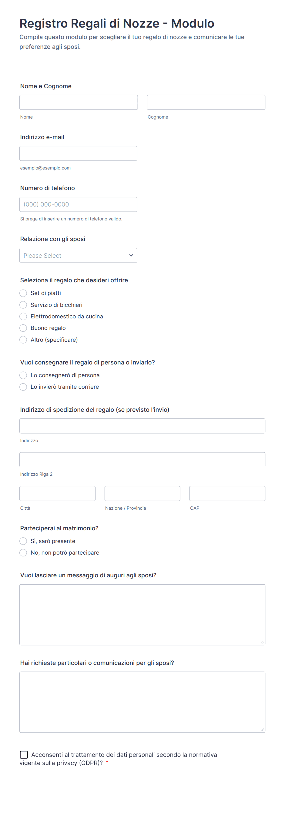 Un modulo di nozze è uno strumento digitale utilizzato per raccogliere, organizzare e gestire informazioni relative alla pianificazione dei matrimoni, come RSVP, dettagli dei fornitori, preferenze degli ospiti e feedback.