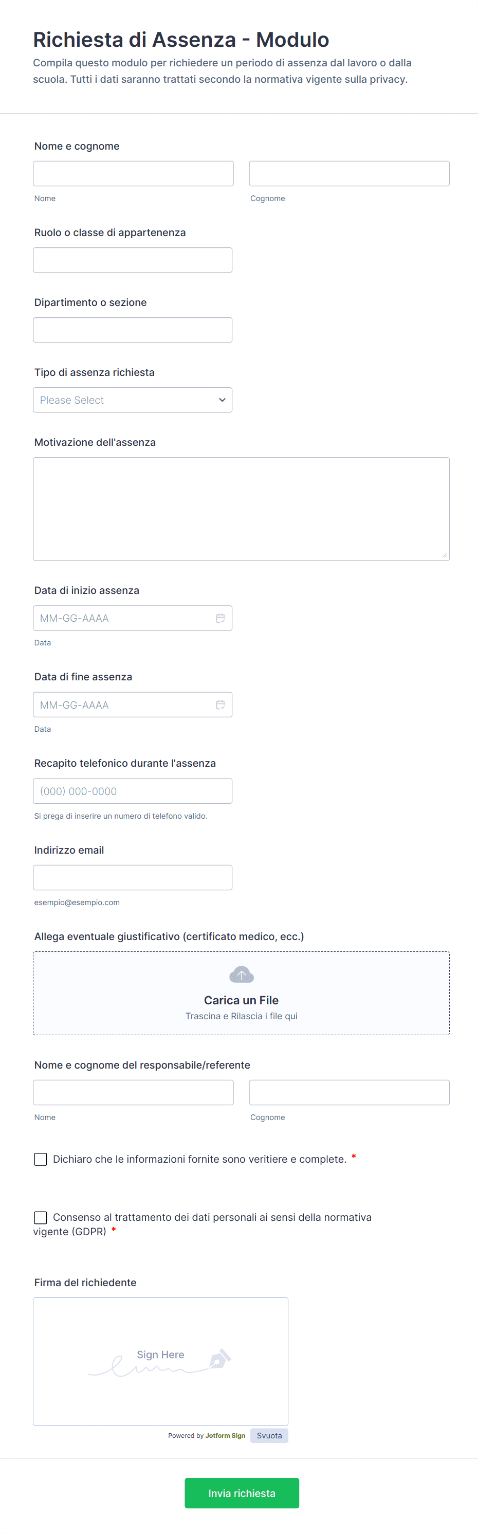 - Richieste di Lavoro da Remoto: Potrebbero includere caselle di controllo per le esigenze di attrezzature o le politiche di lavoro da remoto.