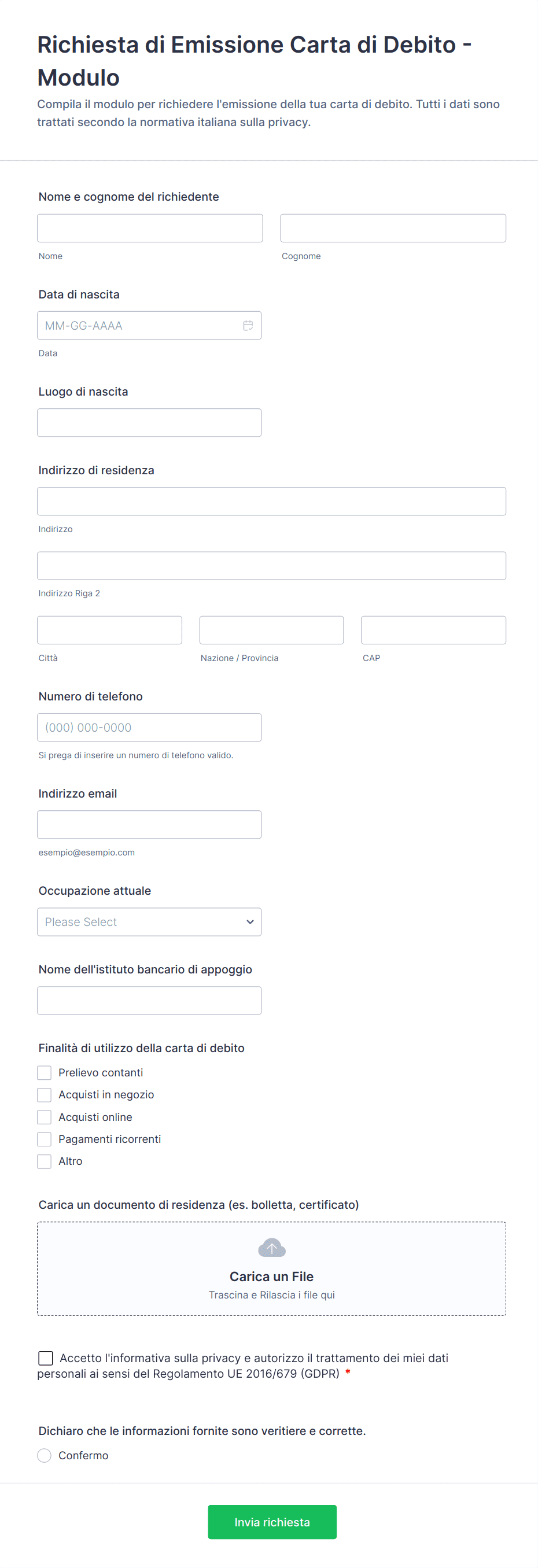 Un modello di modulo bancario è un modulo digitale già pronto, utilizzato dalle istituzioni finanziarie per raccogliere, elaborare e gestire informazioni relative ai servizi bancari, come apertura di conti, richieste di prestiti e verifiche di conformità.