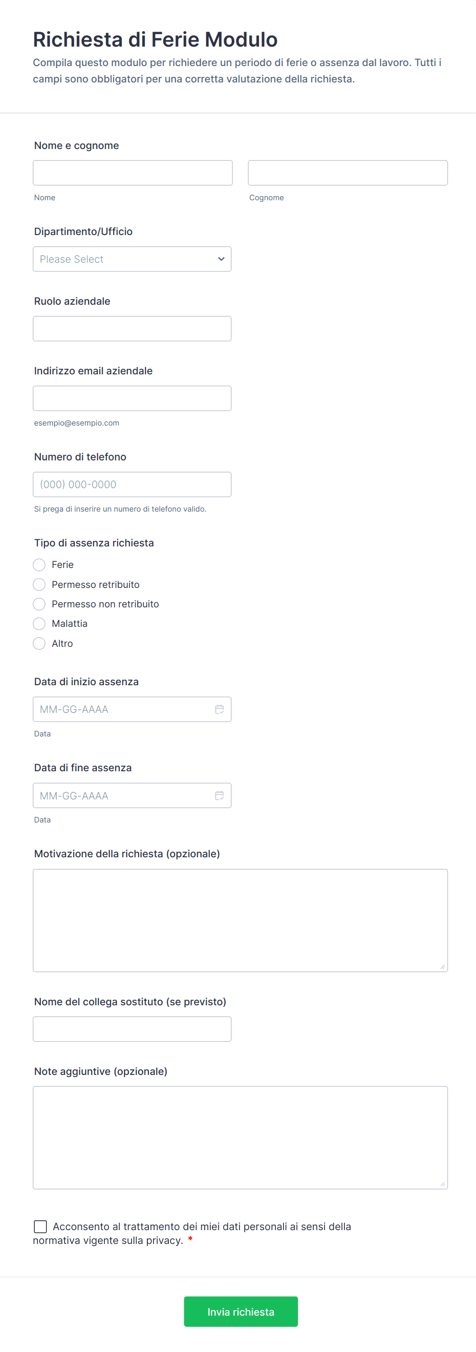 - Richieste di Lavoro da Remoto: Potrebbero includere caselle di controllo per le esigenze di attrezzature o le politiche di lavoro da remoto.