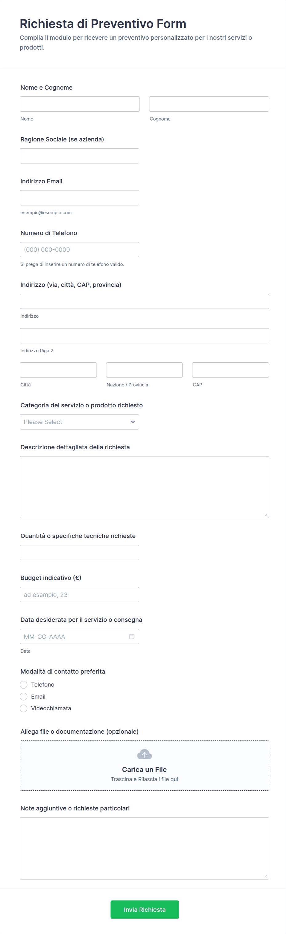 Campi tipici includono dettagli di contatto, selezione di servizi o prodotti, quantità, specifiche di progetto, date preferite e qualsiasi ulteriore requisito rilevante per il preventivo.
