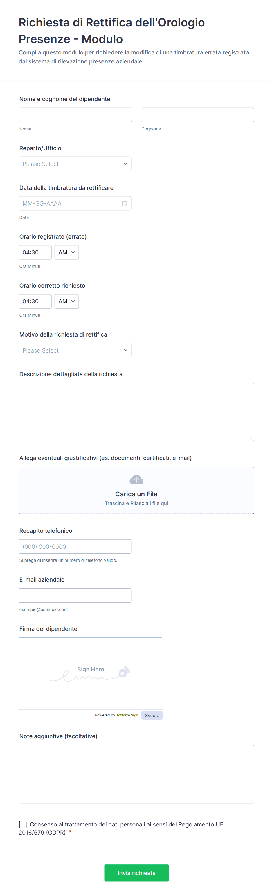 - Modifiche al libro paga: Potrebbero richiedere campi per la matricola del dipendente, il periodo di pagamento, il tipo di modifica e la documentazione di supporto.