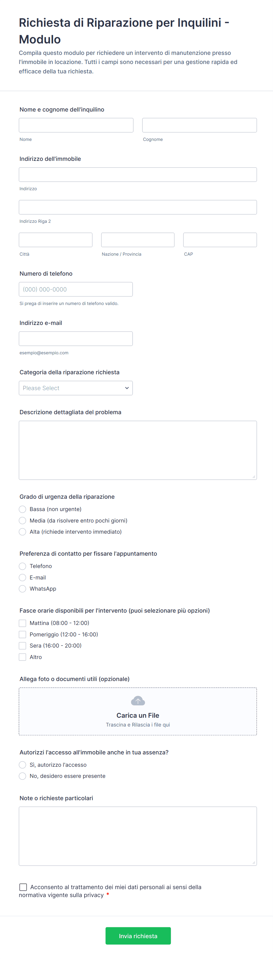 Un modulo per manutenzione è un documento utilizzato dagli inquilini o dagli amministratori di proprietà per richiedere la manutenzione di una proprietà, che si tratti di edifici, arredamento, ecc. I moduli di manutenzione possono anche essere utilizzati dalle squadre di manutenzione per monitorare i progressi di un progetto, rendendo più facile raccogliere informazioni e terminare i lavori in modo efficiente. Con i modelli gratuiti di moduli di manutenzione di Jotform, puoi creare il modulo perfetto per le tue esigenze, personalizzarlo e condividerlo o incorporarlo in pochi minuti, rendendo il processo di manutenzione più rapido ed efficiente.
