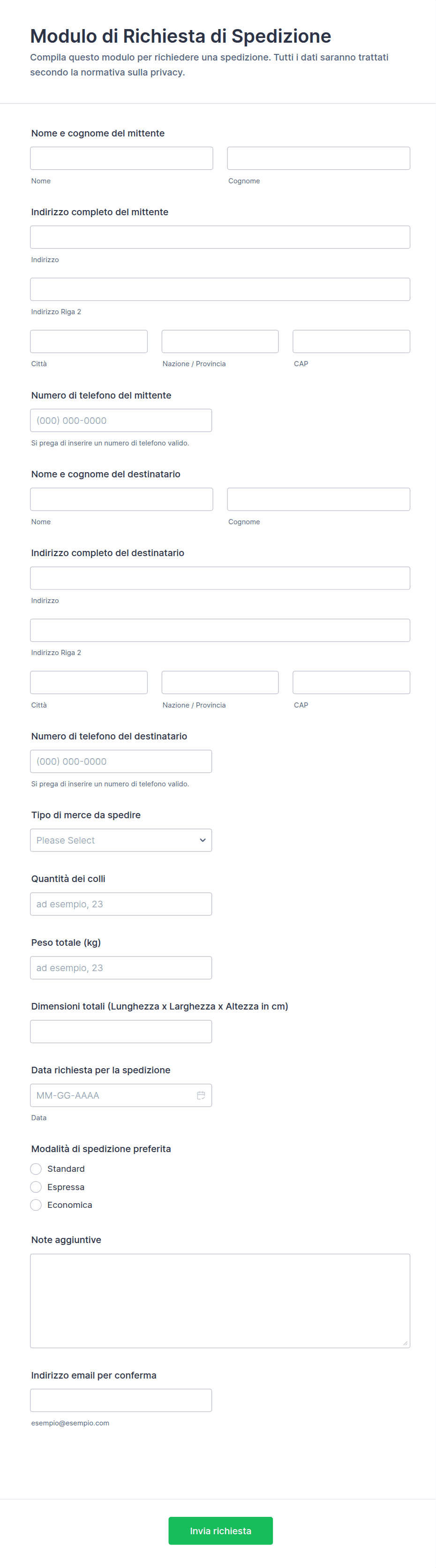 I Moduli per Richiesta di Trasporto sono documenti digitali progettati per semplificare il processo di richiesta, programmazione e gestione dei servizi di trasporto. Questi moduli sono comunemente utilizzati da organizzazioni, scuole, organizzatori di eventi, aziende di logistica e privati per coordinare l'uso dei veicoli, organizzare prelievi e consegne o richiedere opzioni di trasporto speciali. Esempi tipici di utilizzo includono richieste di navetta per dipendenti, trasporto per gite scolastiche, programmazione di trasporti medici, coordinamento dei servizi di consegna e trasferimenti di ospiti per eventi. Centralizzando le richieste di trasporto, questi moduli aiutano a garantire che tutti i dettagli necessari, come le informazioni sui passeggeri, le località di prelievo e consegna, le date, gli orari e i requisiti speciali, siano accuratamente raccolti e comunicati.