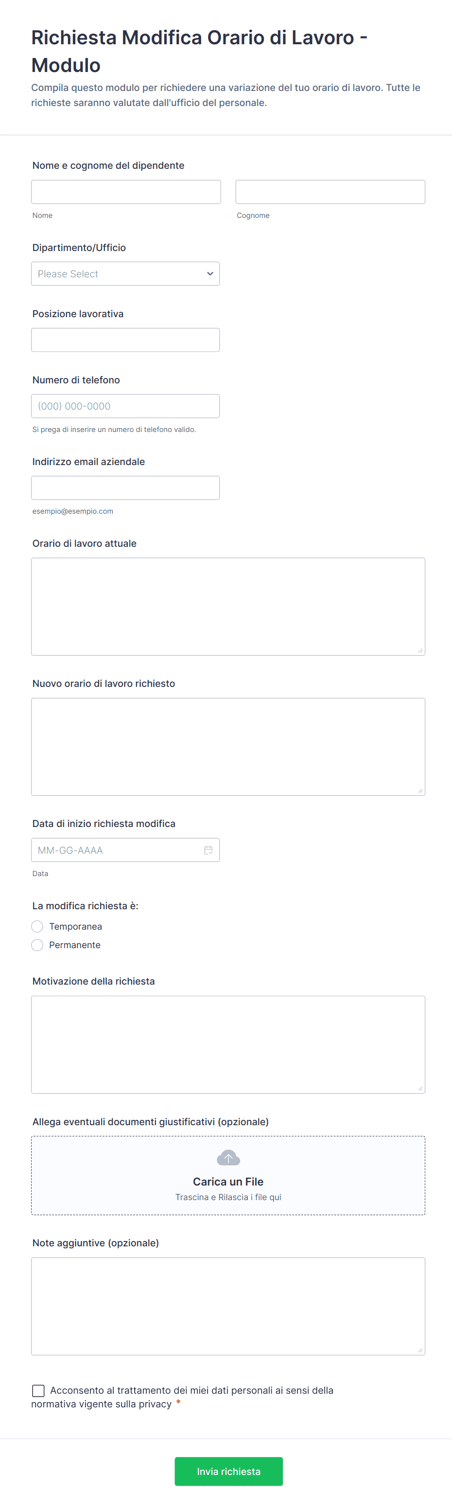 Un Modulo di Richiesta di Modifica è un documento standardizzato utilizzato per richiedere modifiche o correzioni a registri, orari, pagamenti o politiche esistenti all'interno di un'organizzazione.