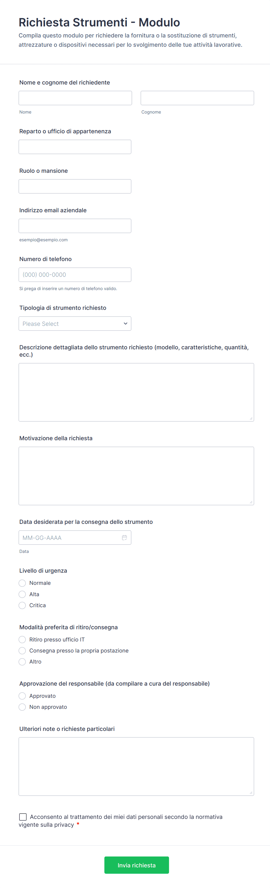 Collect requester name, role, department, and contact info so requests can be routed and fulfilled correctly.