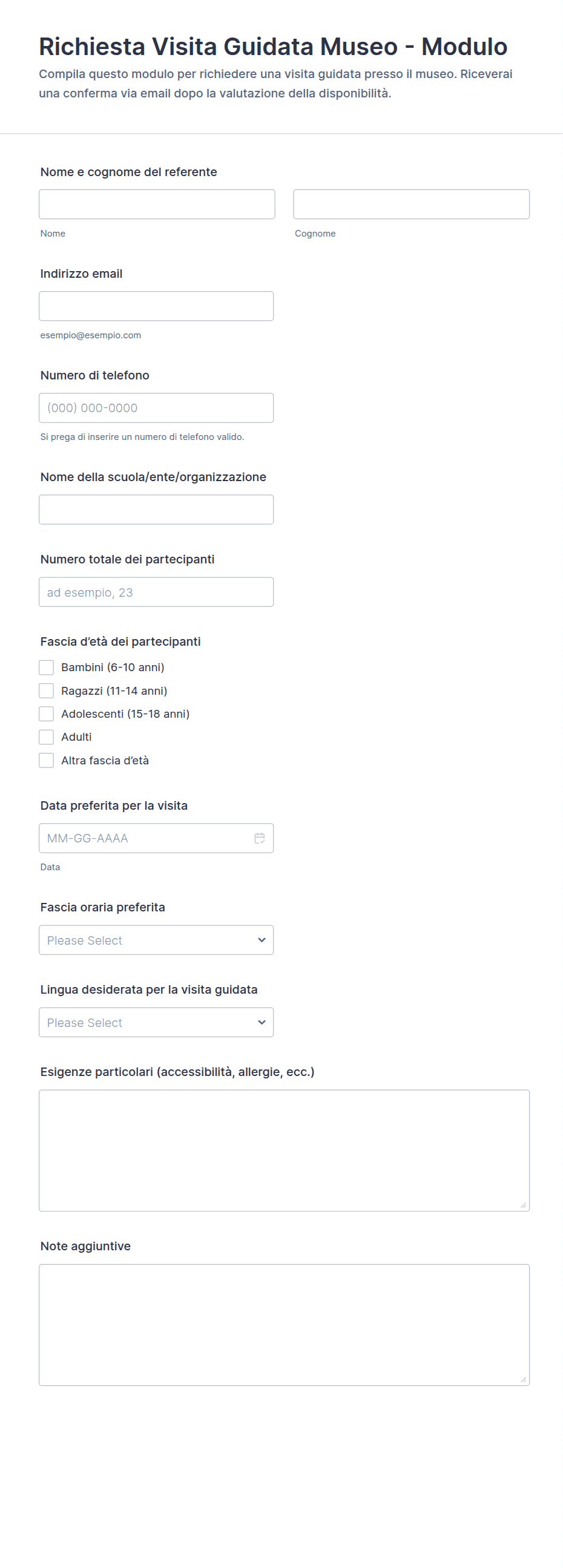 Campi comuni includono nome del partecipante, dettagli di contatto, data e ora preferite, dimensione del gruppo, richieste speciali e, se applicabili, informazioni di pagamento.