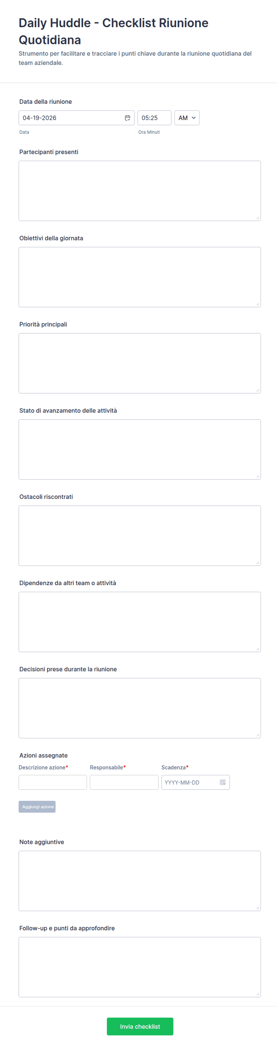 Un modulo per riunioni è uno strumento online utilizzato per organizzare, programmare e gestire le riunioni raccogliendo informazioni essenziali, quali dettagli sui partecipanti, punti all'ordine del giorno e feedback.