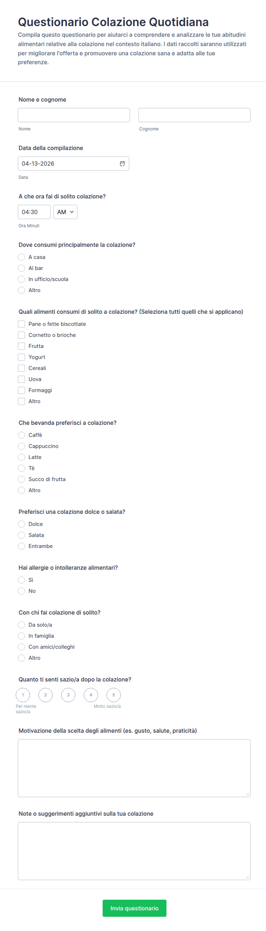 Un modello di questionario è un modulo già pronto, utilizzato per raccogliere informazioni strutturate dagli utenti per vari scopi, come ricerche, feedback o valutazioni.