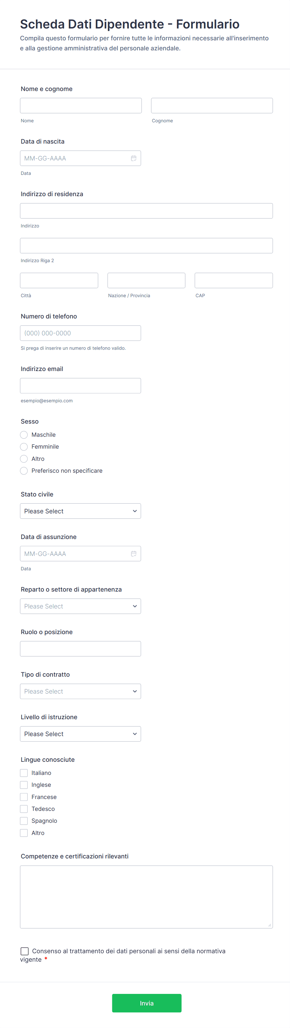 I moduli informativi sui dipendenti sono strumenti essenziali utilizzati dalle organizzazioni per raccogliere, organizzare e gestire i dati chiave del proprio personale. Questi moduli raccolgono in genere dati personali, informazioni di contatto, contatti di emergenza, titoli di lavoro, storia lavorativa e altri dettagli rilevanti, relativi all'impiego. Svolgono un ruolo cruciale nell'inserimento dei nuovi assunti, nell'aggiornamento dei dati dei dipendenti esistenti, e nel garantire la conformità ai requisiti legali e alle politiche delle risorse umane. I casi d'uso spaziano dall'inserimento iniziale e dall'iscrizione ai benefit agli aggiornamenti annuali dei dati e agli audit interni, rendendo questi moduli indispensabili per i dipartimenti delle risorse umane, i manager e i titolari d'azienda.