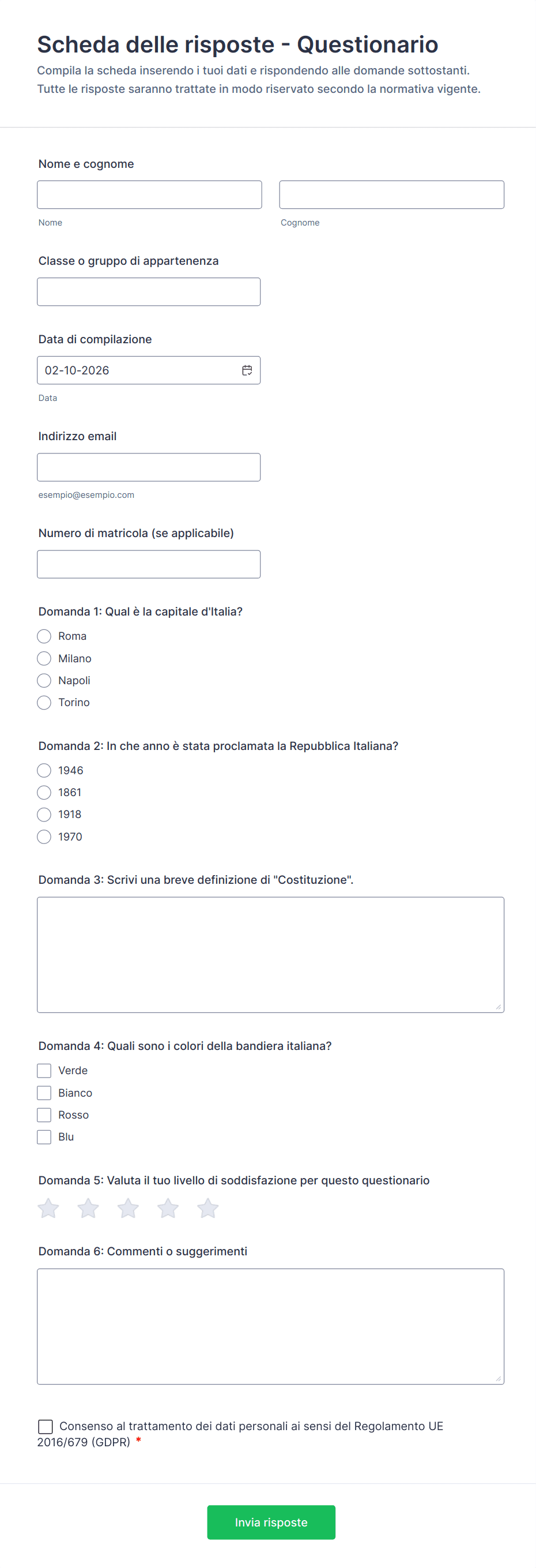 Un modello di questionario è un modulo già pronto, utilizzato per raccogliere informazioni strutturate dagli utenti per vari scopi, come ricerche, feedback o valutazioni.