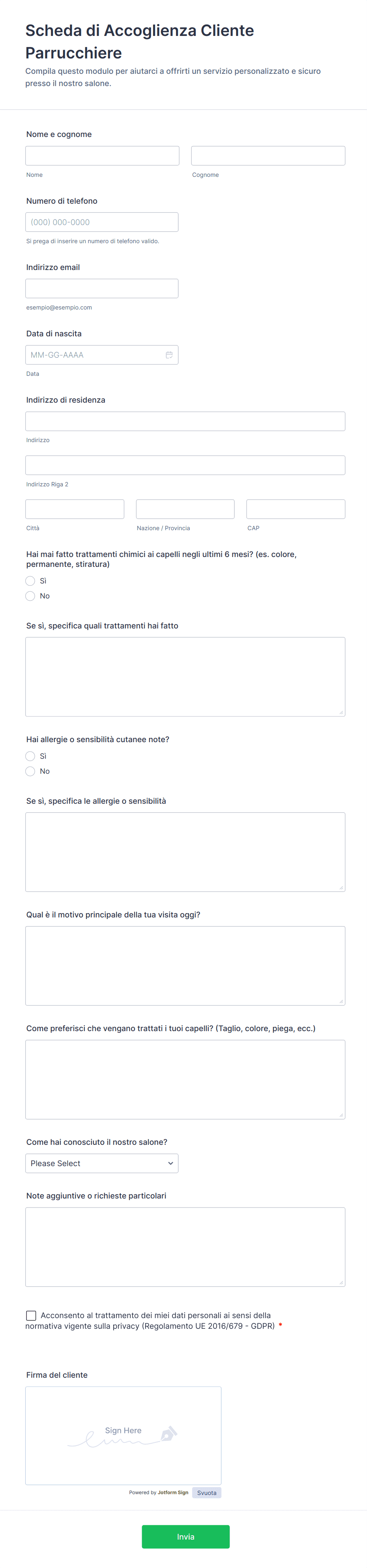 I moduli dei saloni di bellezza aiutano a semplificare le operazioni, ridurre la burocrazia, minimizzare gli errori di prenotazione e garantire che tutte le informazioni necessarie vengano raccolte per un'esperienza cliente sicura e personalizzata.