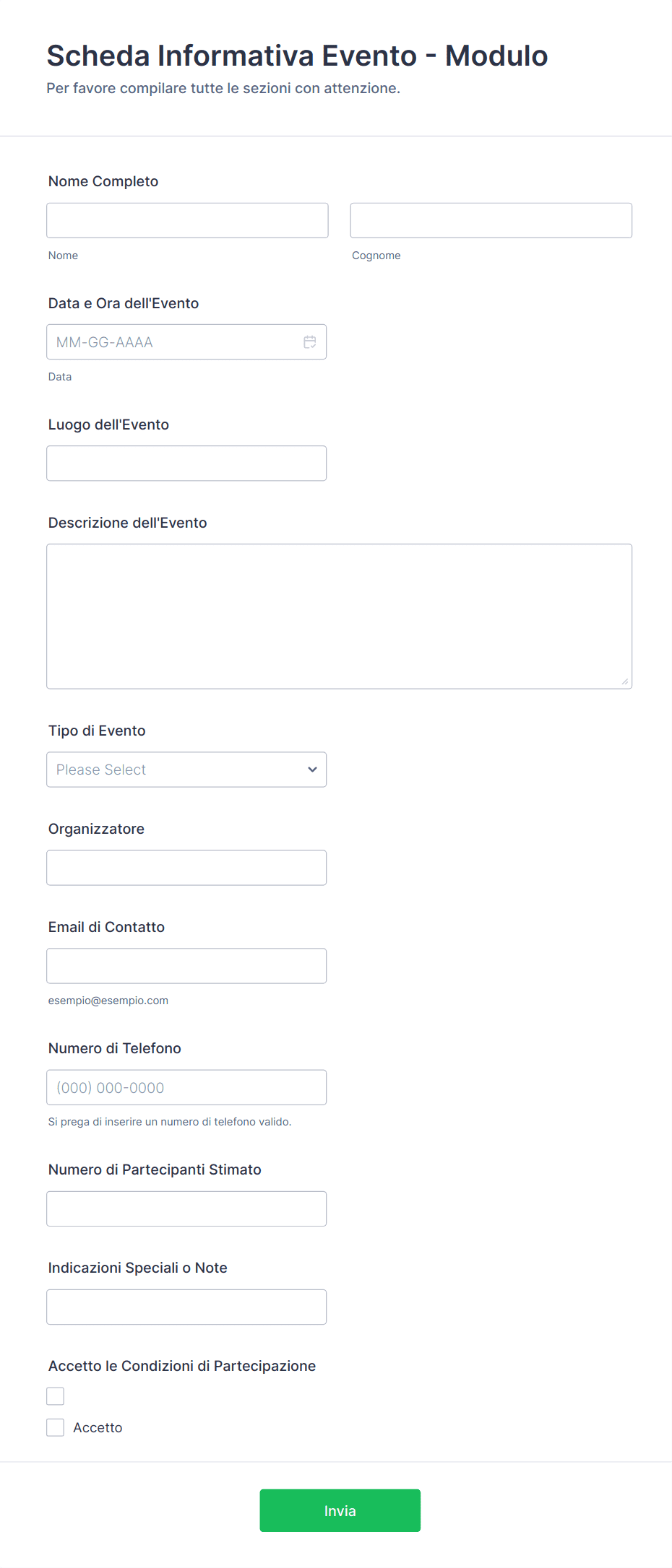- Per casi d'uso specifici, includi campi come menù a tendina per la selezione del dipartimento, campi di caricamento file per l'invio di documenti, o selettori di date per la prenotazione.