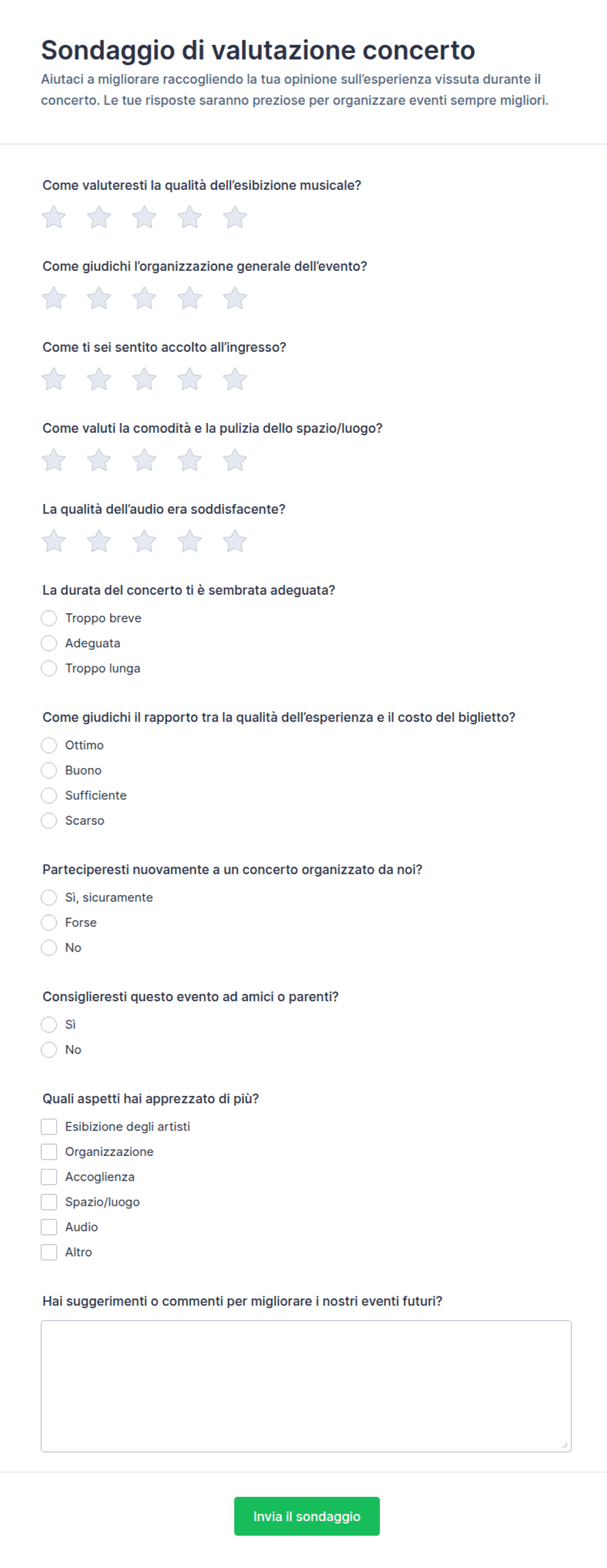 • Domande a scelta multipla o a tendina per aspetti specifici dell'evento (luogo, cibo, logistica)