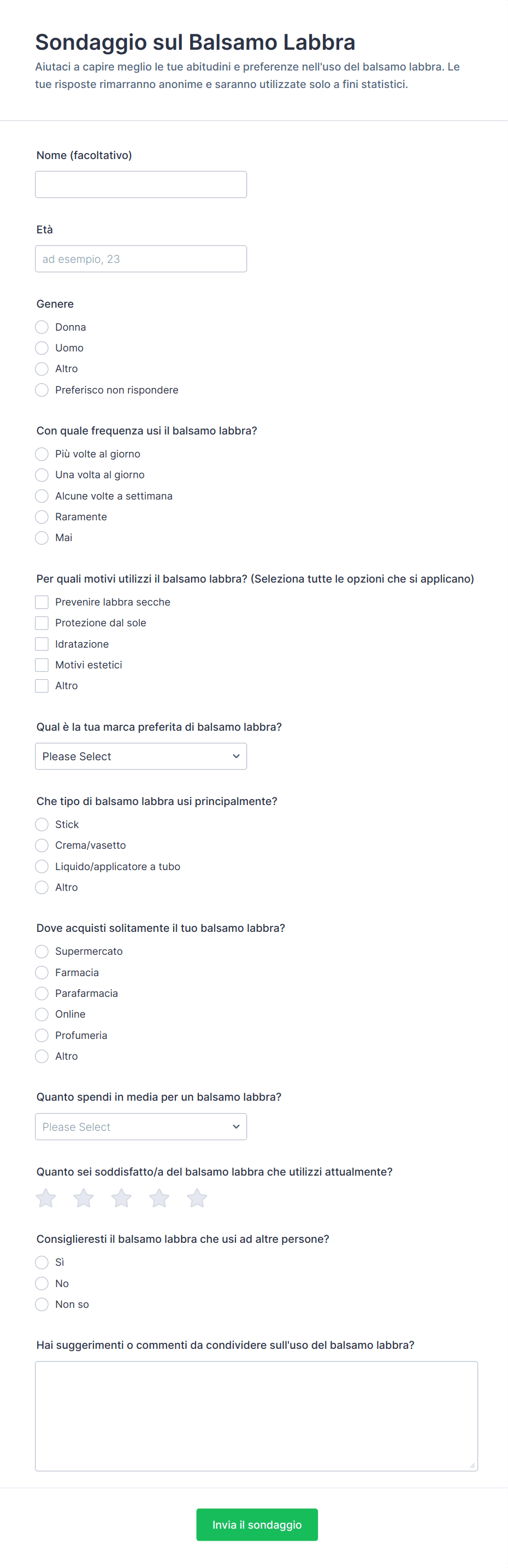 3. Quali informazioni vengono tipicamente raccolte in un sondaggio sul prodotto?