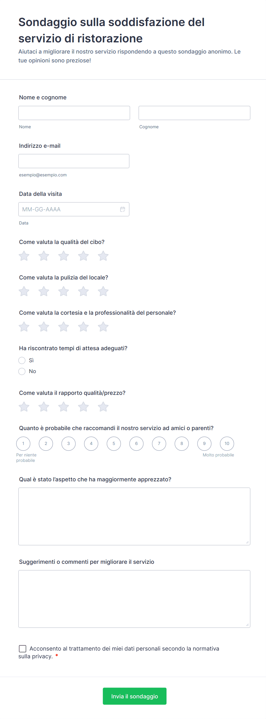 - Scale di valutazione (ad esempio, 1–5 stelle per cibo, servizio, atmosfera)