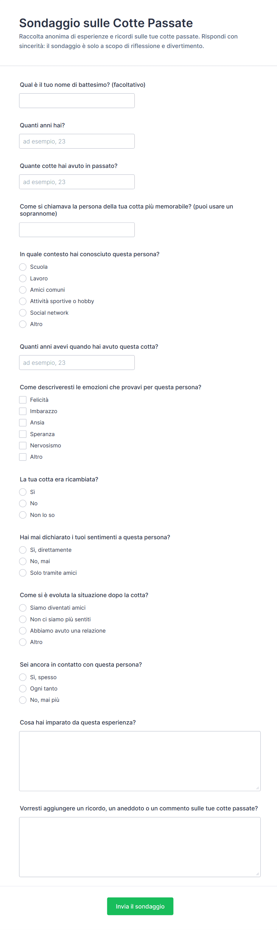 Raccogli ricordi e riflessioni in modo discreto con il Sondaggio sulle cotte passate, ideale per feste, attività di gruppo, classi e community che vogliono facilitare la raccolta dati con Jotform.