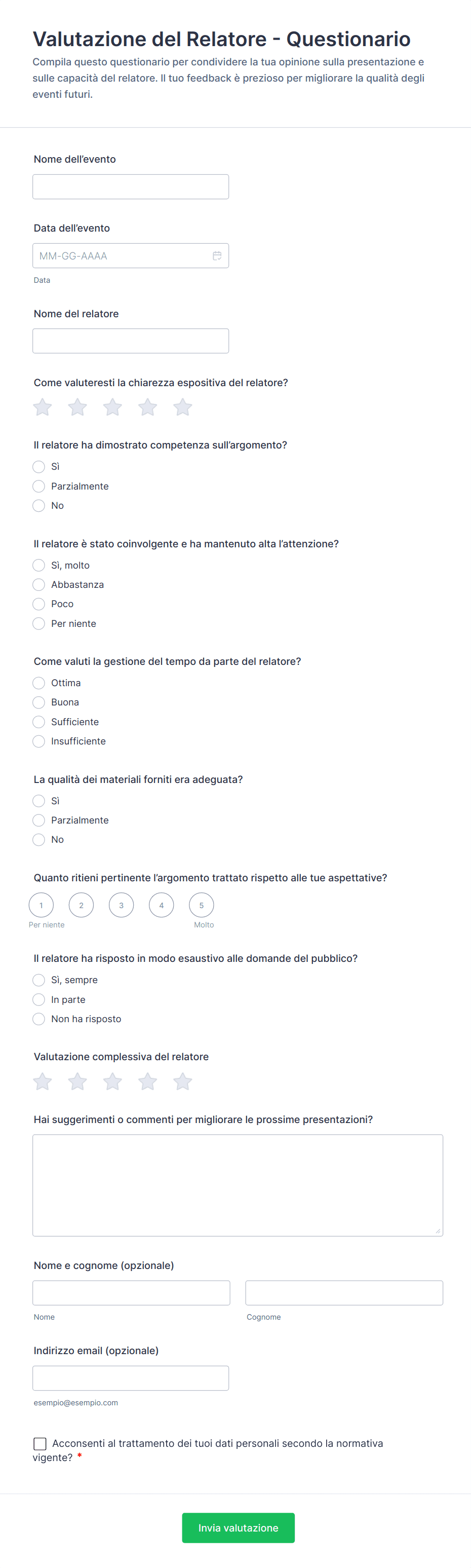 - Valutazione del relatore: Includere domande sulle abilità di presentazione, conoscenza e coinvolgimento.