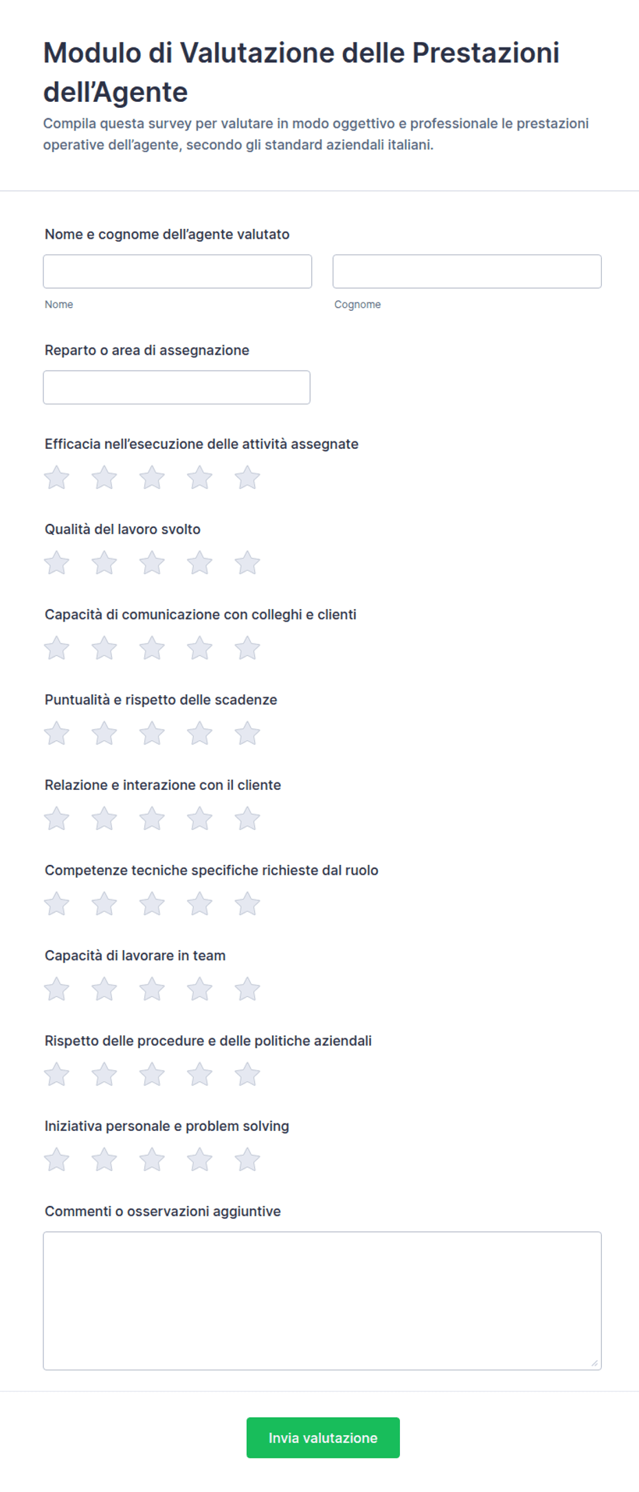 Il Modulo di Valutazione delle Prestazioni dell’Agente supporta aziende e responsabili nella raccolta dati sulle performance del personale, creando valutazioni coerenti e archiviando ogni risposta per analisi e follow-up.