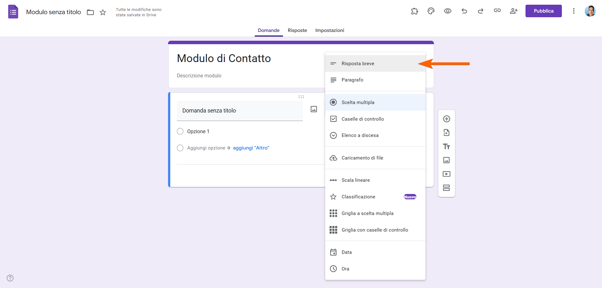 - La prima domanda verrà aggiunta automaticamente al modulo. Se hai bisogno di una casella di testo, seleziona Risposta breve tra le opzioni di domanda nel menu a discesa a destra. Poi puoi aggiungere la tua domanda o il nome del campo.