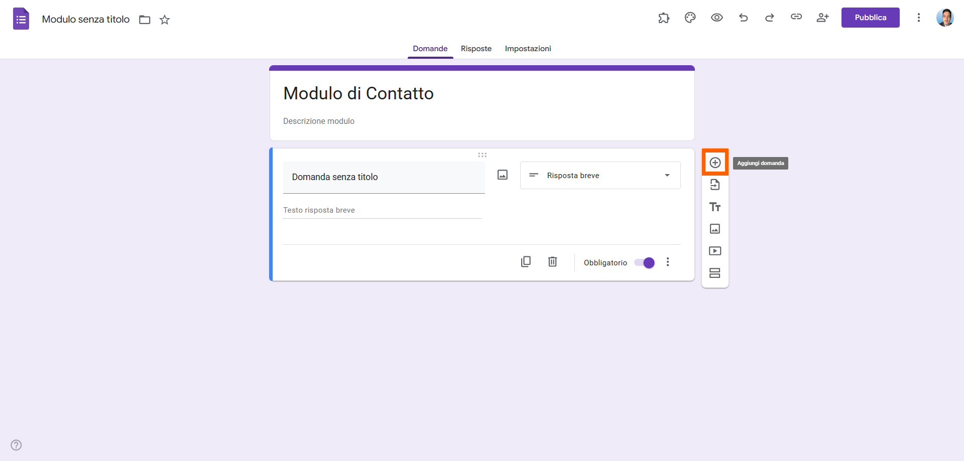- Per aggiungere una nuova domanda, fai clic sul simbolo + Aggiungi domanda nella barra verticale a destra della tua domanda attuale.