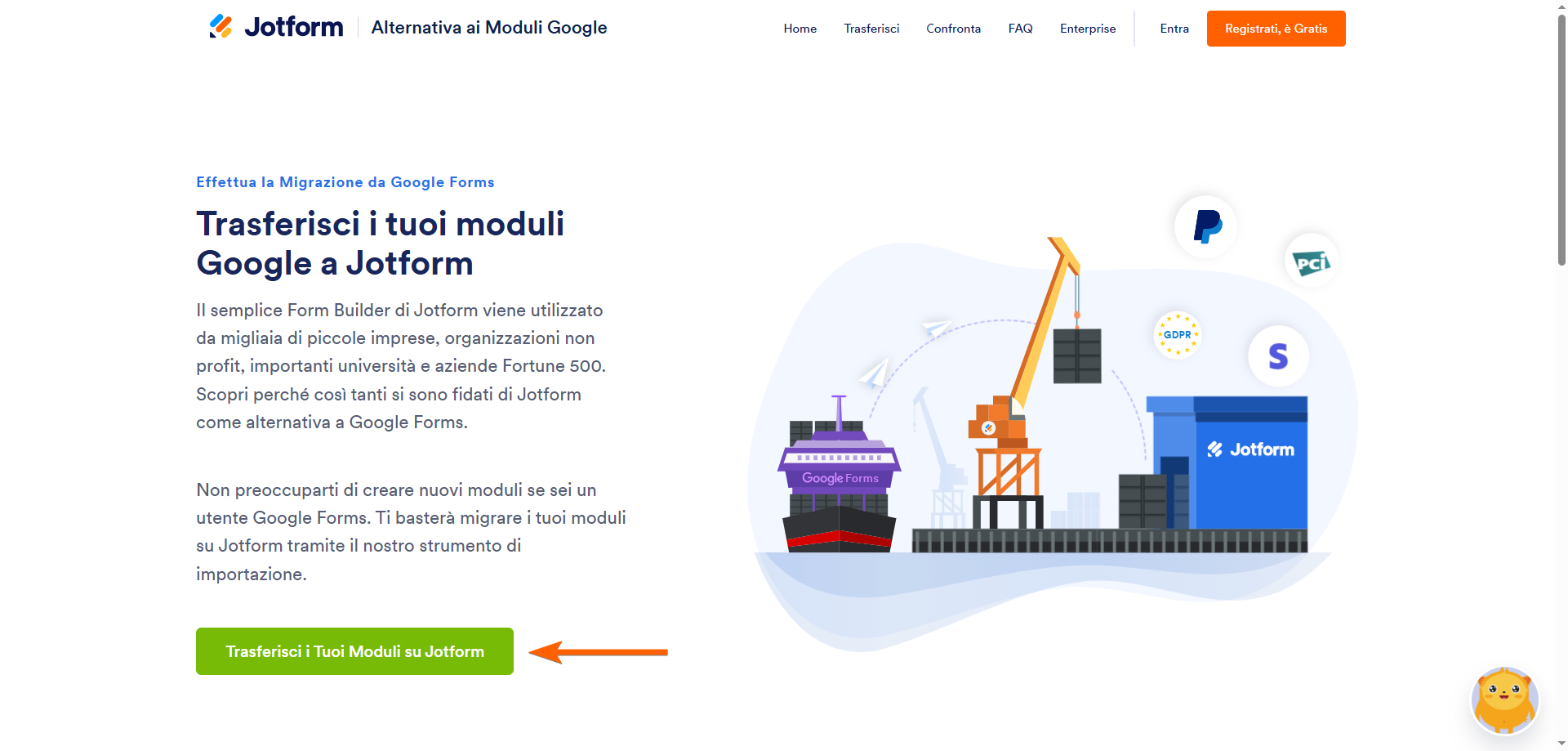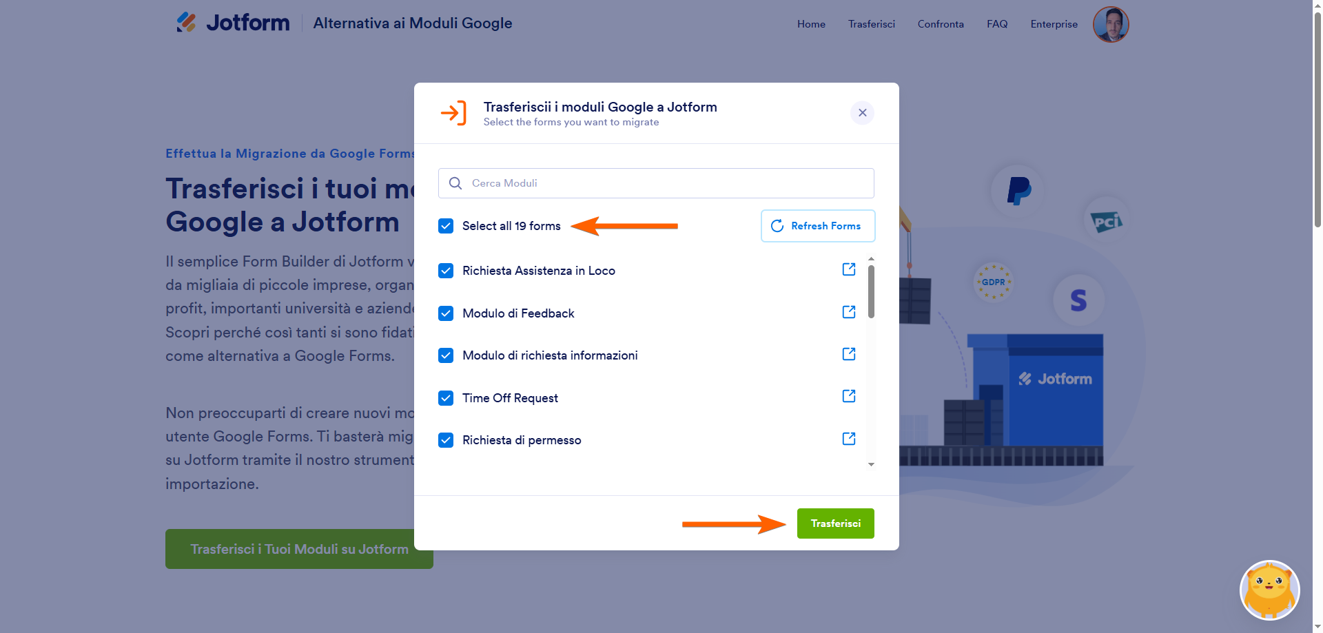 - Seleziona Trasferisci i Tuoi Moduli su Jotform.
