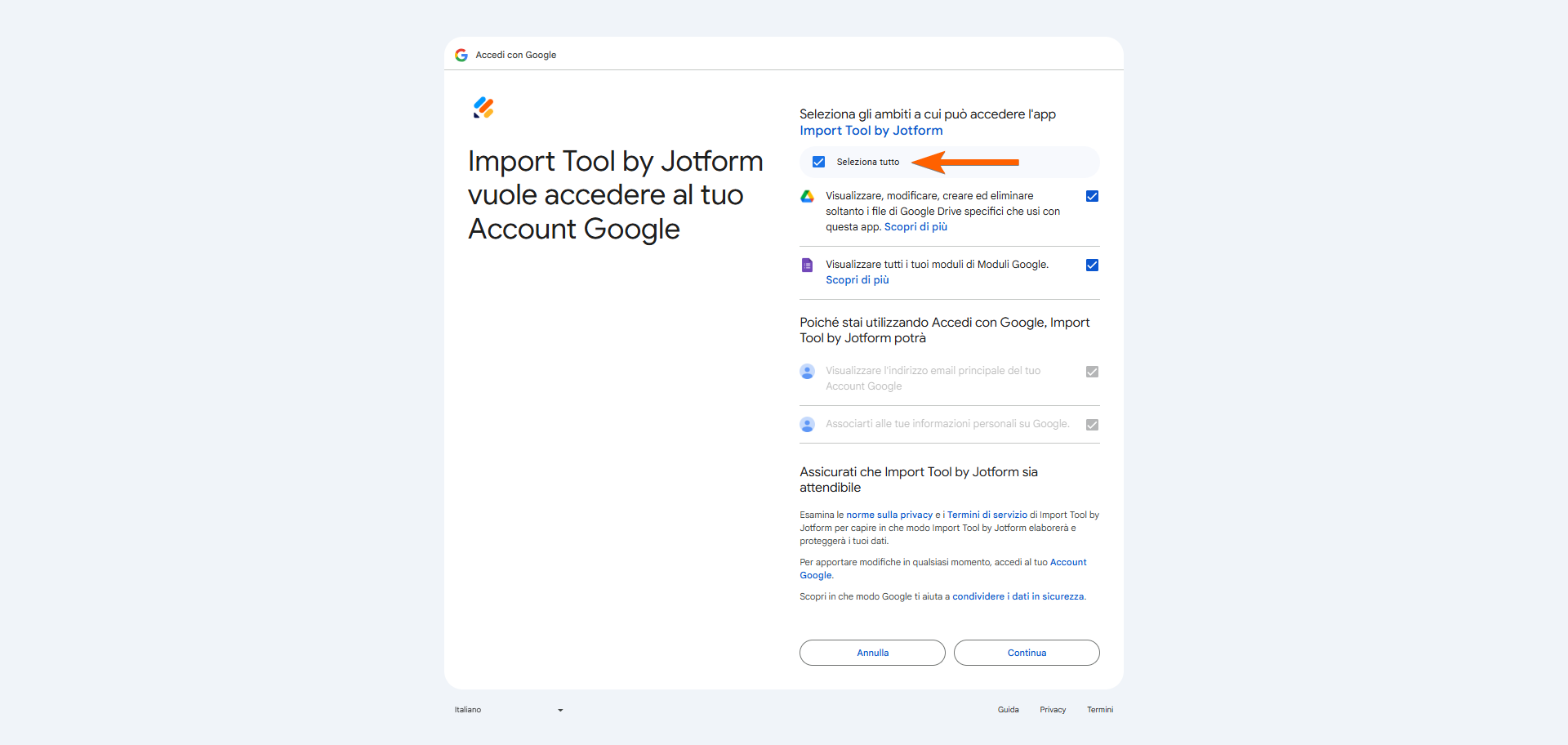 - Accedi all’account Google dal quale desideri trasferire i moduli e spunta la casella Seleziona tutto per permettere a Jotform di accedere ai tuoi file. Poi fai clic su Continua.