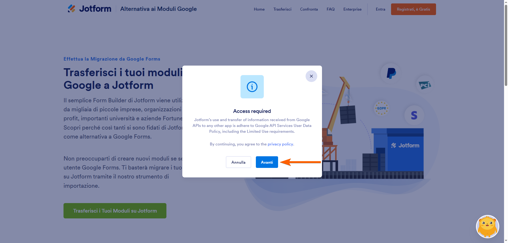 - Accetta l’informativa sulla privacy di Jotform cliccando su Avanti.