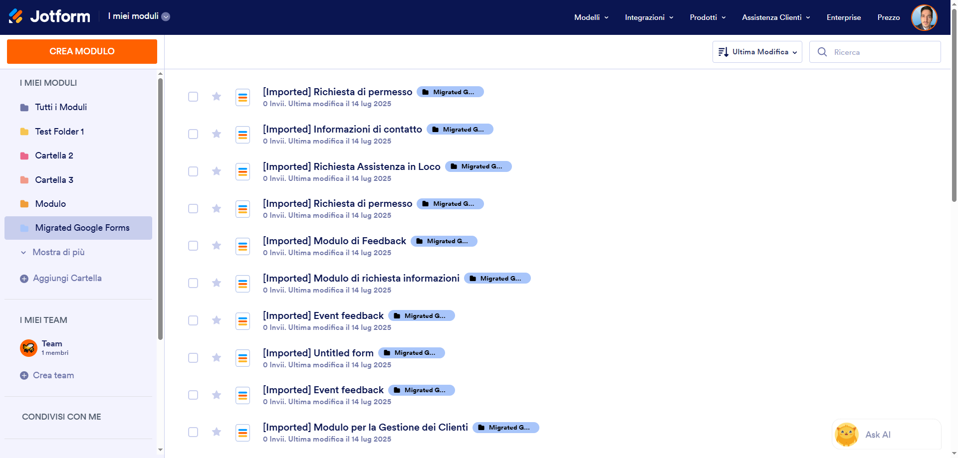 - Per i moduli trasferiti verrà creata una cartella con il nome Migrated Google Forms, e i moduli saranno contrassegnati come “[Imported]” con un’icona accanto a essi che mostra che si trovano nella nuova cartella. Se vuoi, puoi rinominare i moduli per eliminare l’etichetta Imported.