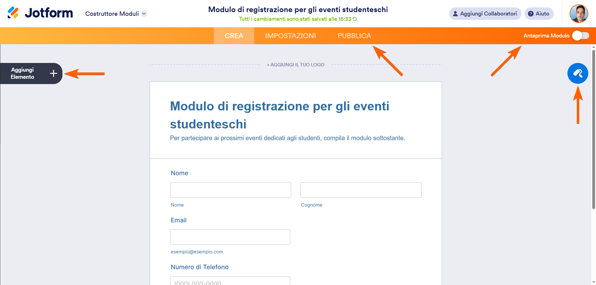 - L’IA genererà il tuo modulo e lo aprirà automaticamente nel Costruttore Moduli di Jotform. Controlla il tuo modulo, poi trascina e rilascia i campi del modulo per modificarne l’ordine ed elimina quelli di cui non ne hai bisogna. Clicca su un campo del modulo per modificarlo. Se desideri aggiungere nuovi campi del modulo, clicca su Aggiungi Elemento e scegli il campo che desideri aggiungere. Per cambiare il design, clicca sull’icona del rullo di vernice per aprire il Designer Modulo. Per visualizzare in anteprima il modulo, abilita l’interruttore Anteprima Modulo. Una volta pronto a condividere il modulo, clicca sulla scheda Pubblica.