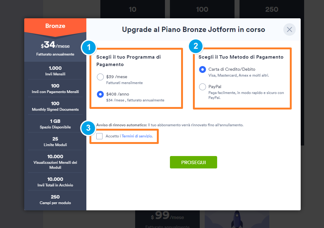 - Apparirà una finestra popup che ti permetterà di scegliere il periodo di fatturazione e il metodo di pagamento. Puoi selezionare il Piano Mensile, Annuale o Biennale. Assicurati di spuntare la casella per accettare i nostri termini. Fare clic sul pulsante “Prosegui”.