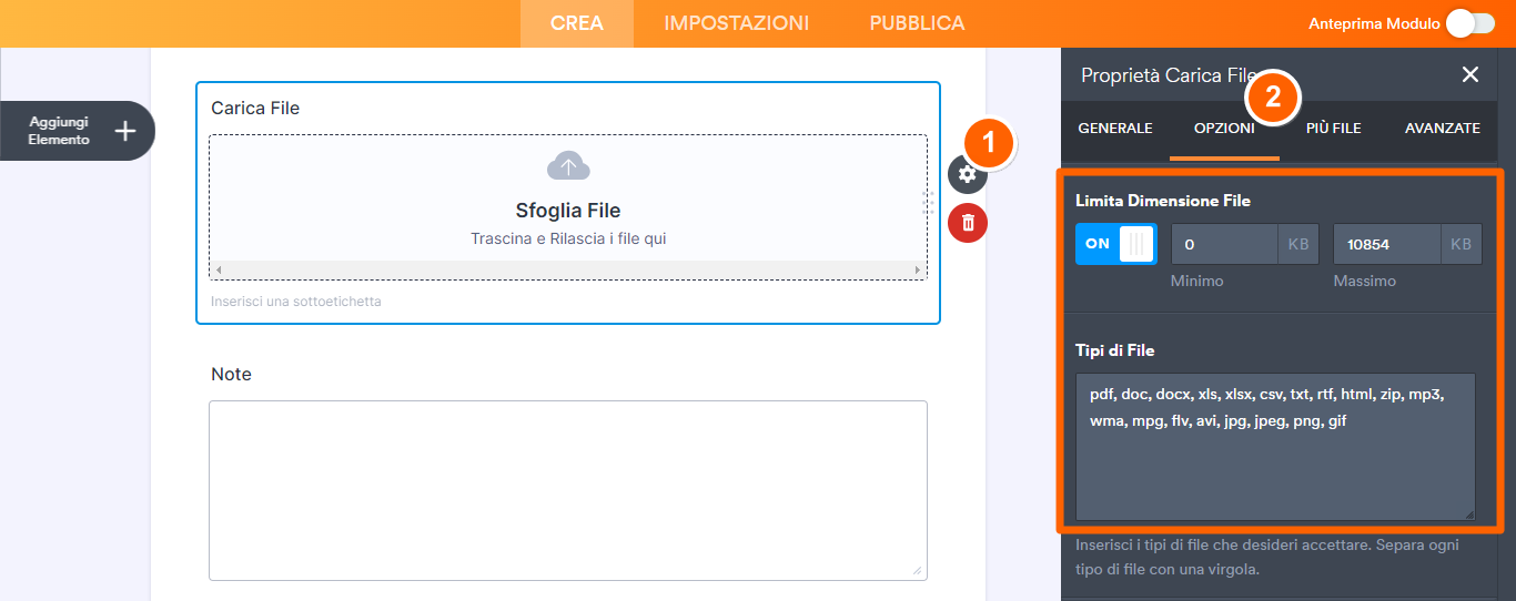 Guarda Come Modificare i Tipi di File Consentiti nel Campo di Caricamento e come Cambiare il Limite Dimensione File di Upload per ulteriori informazioni.