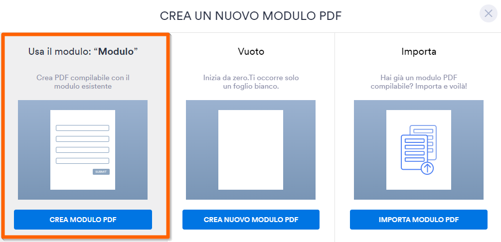 Se vedi soltanto due opzioni (Vuoto e Importa), significa che hai già un PDF compilabile esistente per il modulo sul quale stai attualmente lavorando dal PDF Editor.