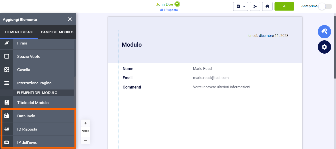 Per prima cosa, parliamo dei dettagli della risposta: Data Invio, ID Risposta, e IP dell’invio. Disponibili alla sezione Elementi di Base > Elementi del Modulo, nel PDF Editor, questi dettagli sono sempre disponibili per tutti i moduli. Puoi aggiungerli al tuo documento PDF selezionandoli o trascinandoli dove desideri.