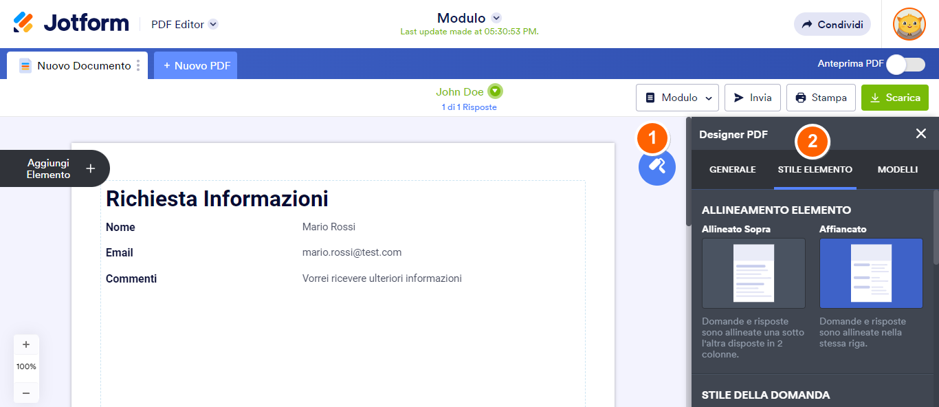 Ora, prova a creare un semplice documento PDF con i dati della compilazione, selezionando i campi che desideri aggiungere al tuo documento.