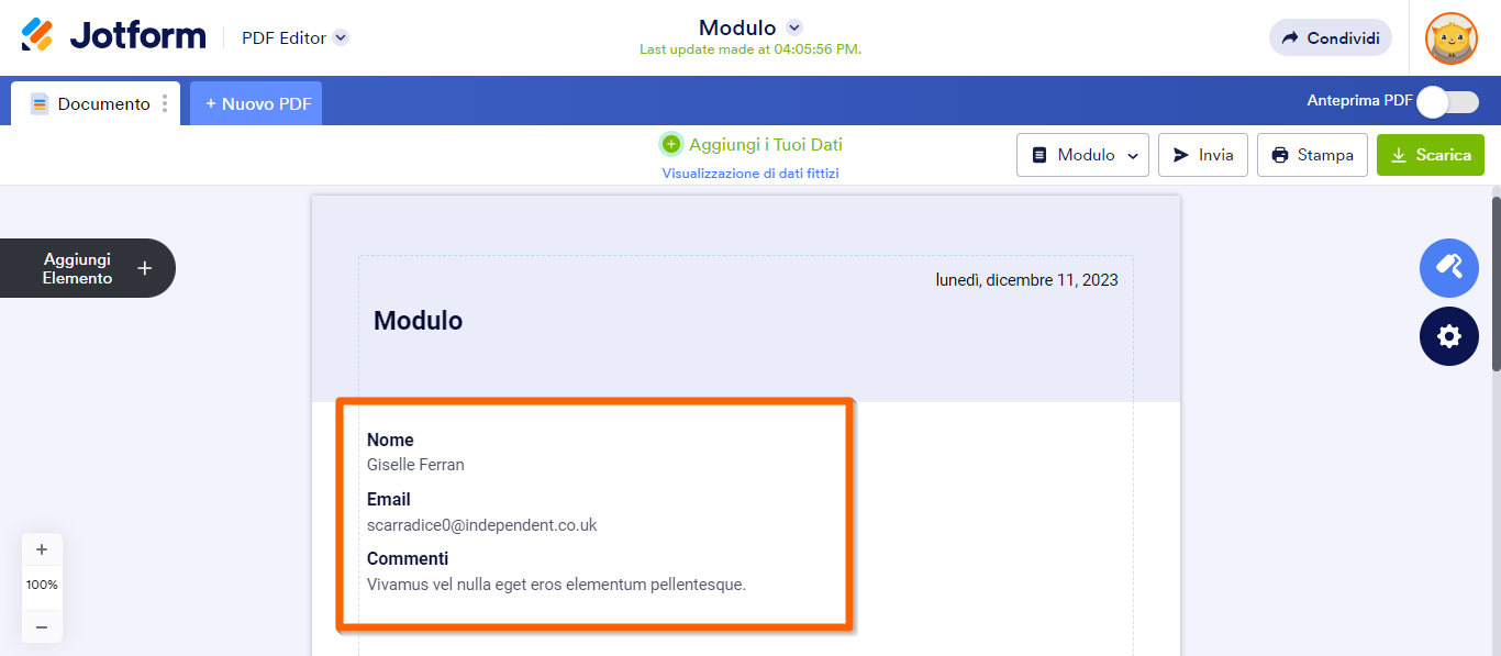Se non hai ancora ricevuto risposte sul tuo modulo, il PDF Editor genererà dei dati fittizi sul PDF.