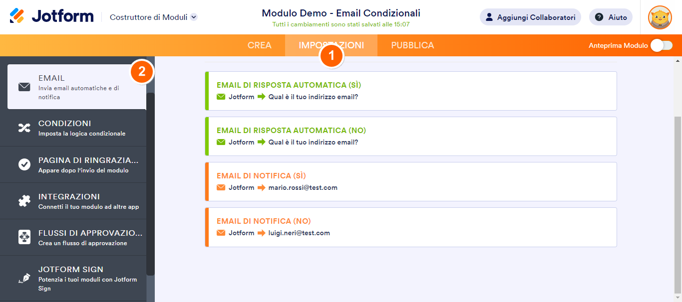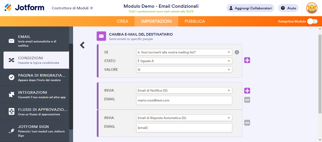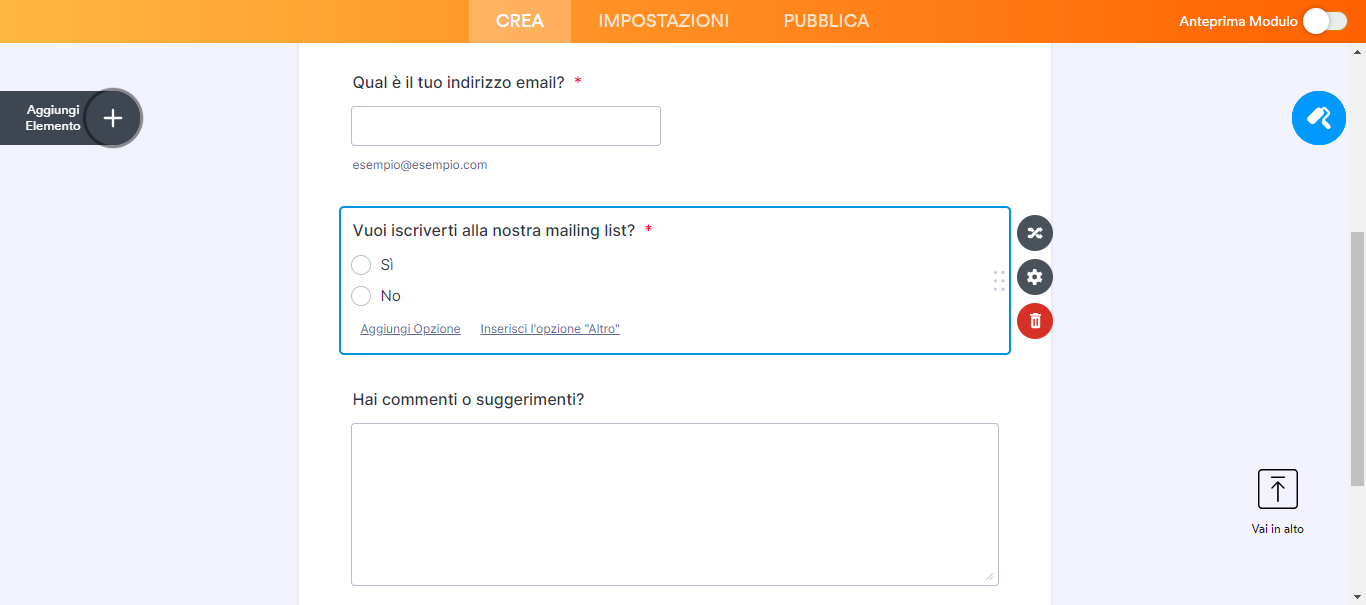 Nel modulo di esempio qui di seguito, la logica condizionale è applicata alla domanda “Vuoi iscriverti alla nostra mailing list?”, e saranno inviate email differenti in base alla risposta dell’utente.