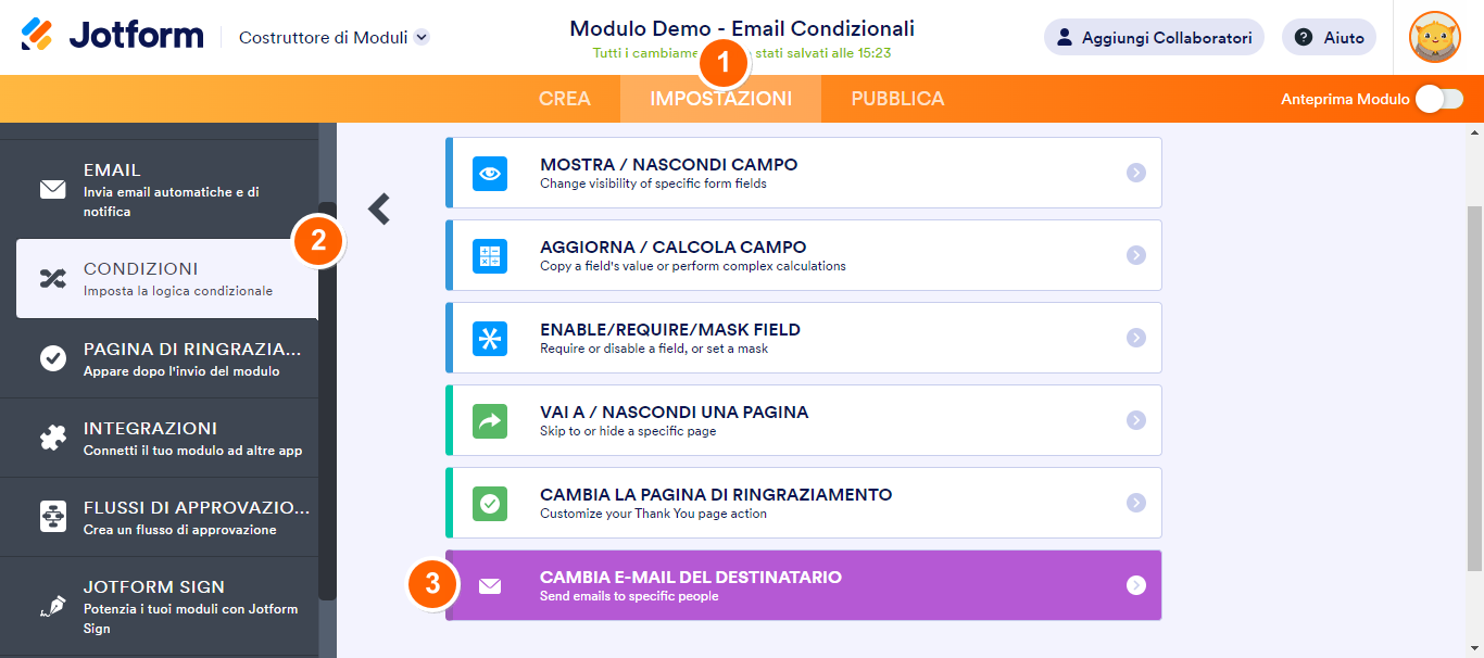 - Gli account Base, possono creare su un modulo fino a tre condizioni “Cambia E-mail del destinatario”. Mentre per i piani a pagamento non ci sono limiti.