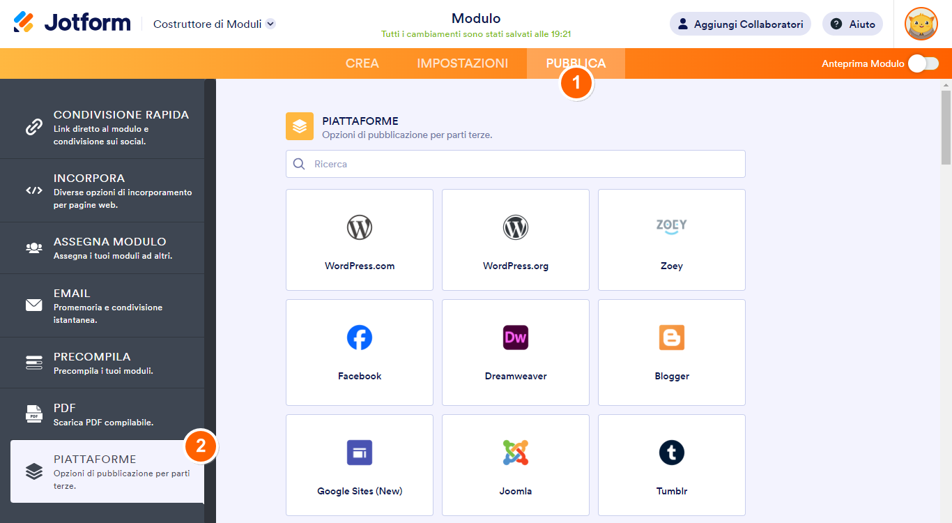 Esistono anche specifici modi di incorporare il modulo su altri generatori di siti web e CMS. Se ne stai utilizzando uno, vai al menù Piattaforme e scegli la piattaforma che utilizzi.