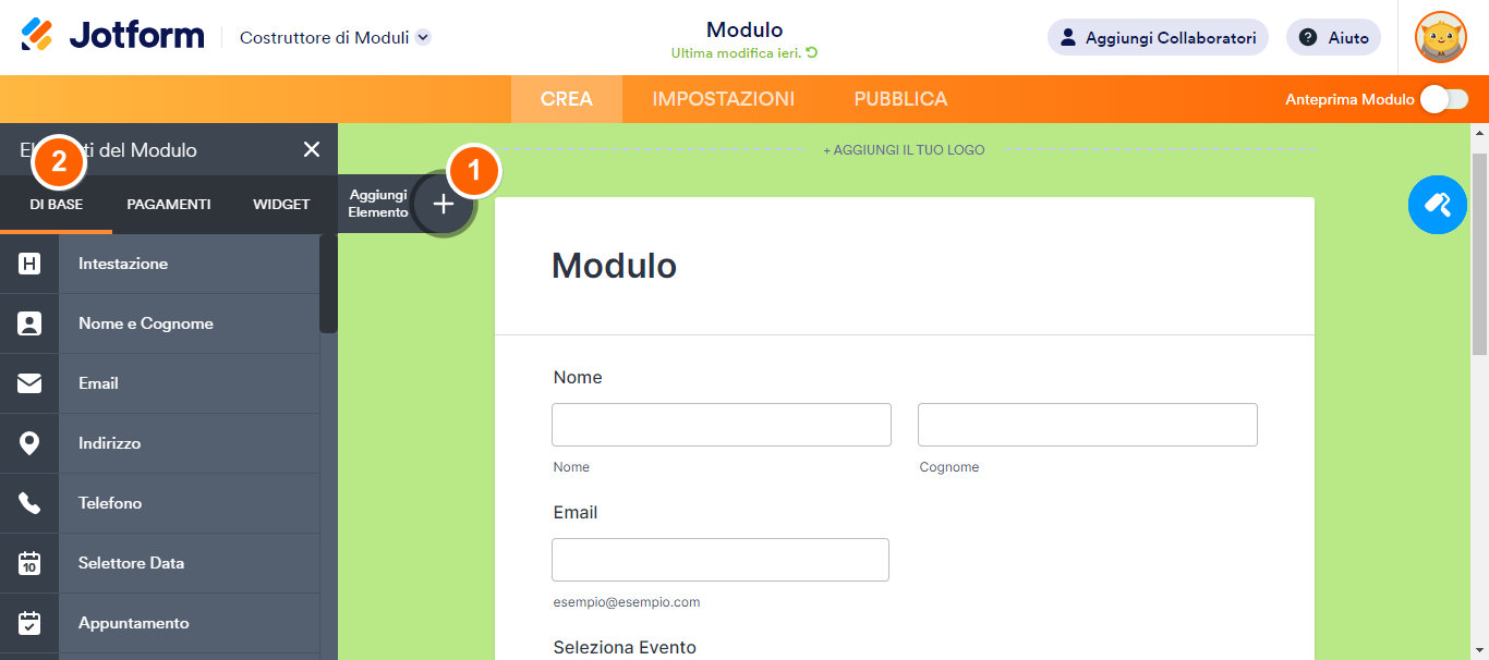 Chiedi ai visitatori il proprio nome e indirizzo e-mail in modo da poter tenere traccia dei contatti generati dal tuo modulo e poter dare seguito alle richieste dei visitatori. Clicca su Aggiungi Elemento a sinistra del Costruttore di Moduli. Nella scheda degli elementi Di Base troverai tutti gli elementi standard del modulo.