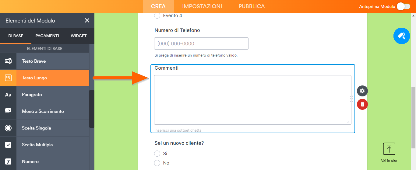Un’ampia casella di testo permette ai visitatori di fornire risposte più lunghe ed elaborate. Utilizza il campo Testo Lungo disponibile dal pannello degli Elementi del Modulo sulla sinistra, sotto la scheda Di Base.